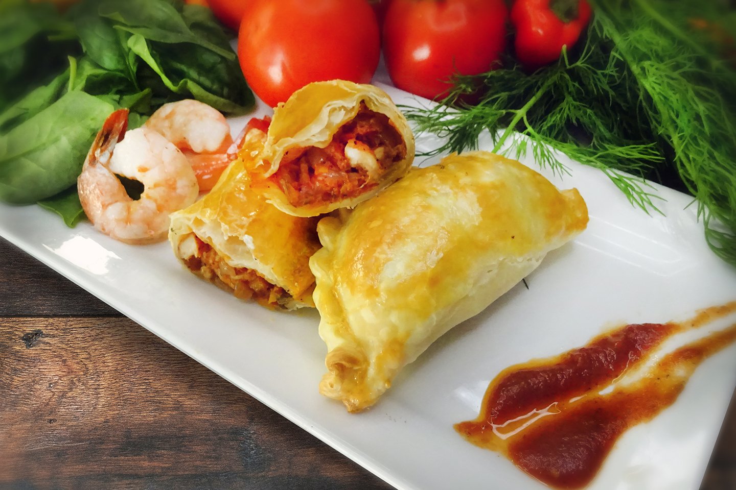 Pescatarian love! Shrimp stew with sofrito, peppers, onions, tomatoes, herbs, and spices on a flaky crust. These empanadas are an explosion of flavors from the first bite on.